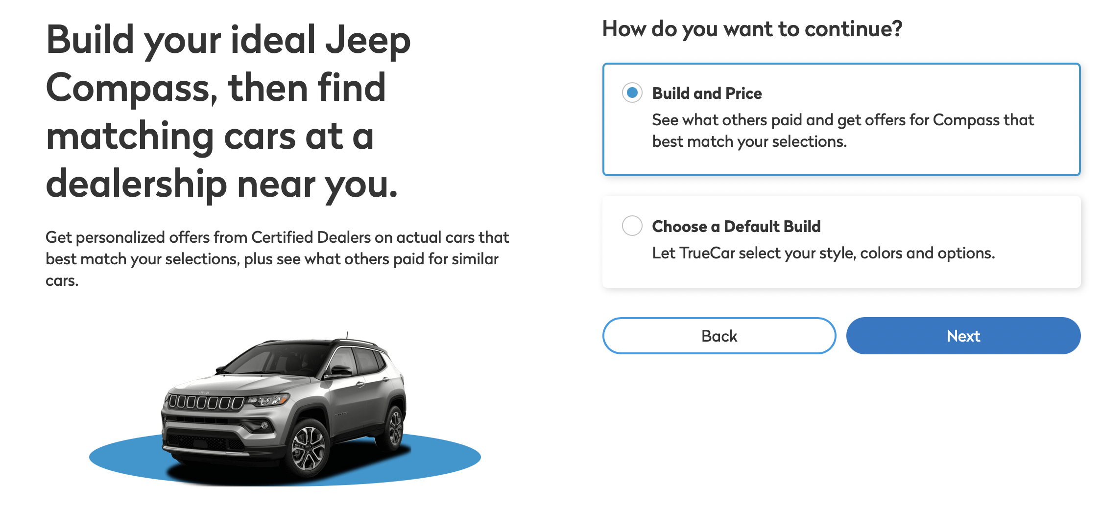 - 예를 들어, 2022 Jeep Compass를 Latitude FWD 로 구매하려고 선택했는데 90%로 Match 일치하는 차량을 San Jose 에서 $29,265에 팔겠다고 올려놓은 걸 확인할 수 있다. TrueCars.com 에서 확보한 데이터에 따르면 이 가격으로 구매하면 Exceptional Price로 구매하는 것이라고 표시도 해준다. 여기서 주의할 점은 $29,265는 OTD (Out-The-Door) 가격이 아니라는 점이다.