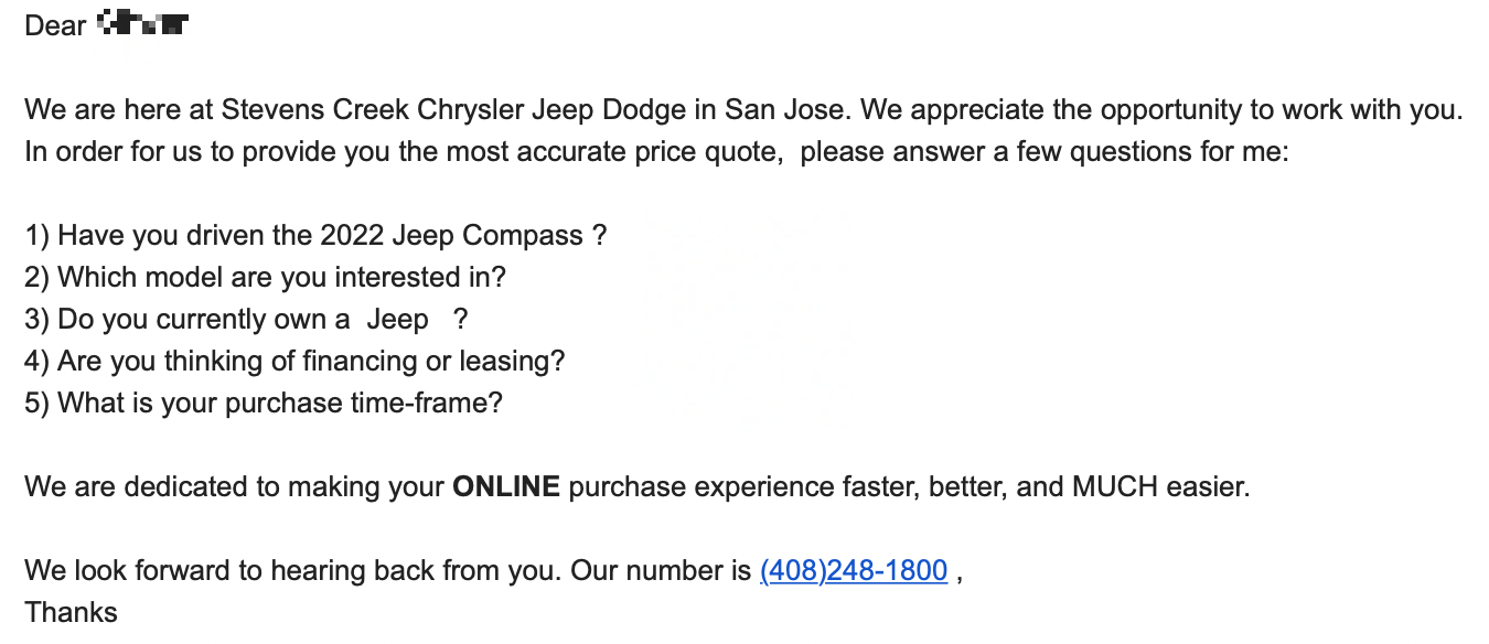 6. TrueCars.com 에서 Check Availability 혹은 Get Your Offer 버튼을 누르고, 개인 Email 주소 혹은 Phone No.를 입력하면 이제 딜러들에게 연락이 마구 오기 시작한다. 전화, 문자, 이메일 가리지 않고 오는데, 일반적으로 이메일로 주로 커뮤니케이션 하는 걸 추천한다. 대충 이런식으로 메일이 온다.