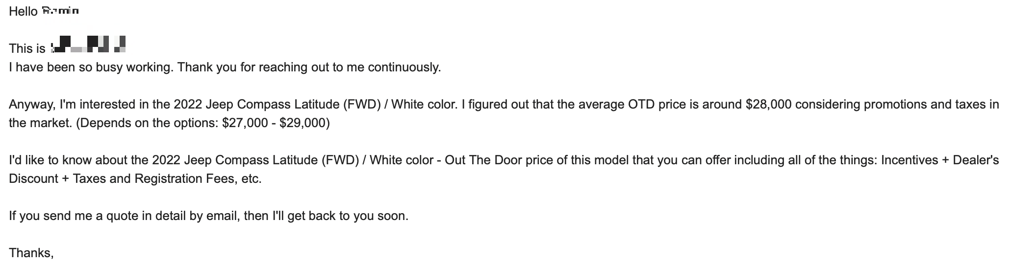 7. 그럼 며칠 좀 있다가 아래와 같이 답장을 해준다. 핵심은 OTD 가격을 제안해달라고 하는거고, 시장에서 대략 요즘 어느 정도에 팔리고 있는데 나에게 어느 정도 가격까지 해줄 수 있는지 물어보는 것이다. 이런 식의 메일을 딜러들에게 다 보내면 OTD 가격을 제안해준다.