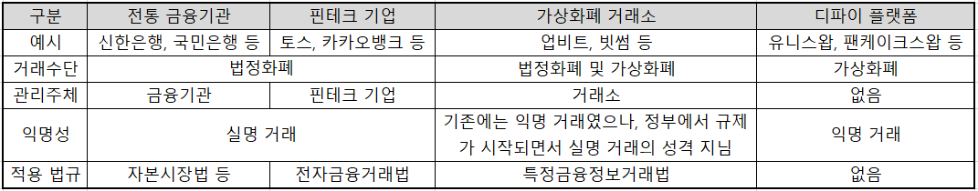 전통 금융기관 vs. 핀테크 기업 vs. 가상화폐 거래소 vs. 탈중앙화 거래소 (디파이 플랫폼) 비교